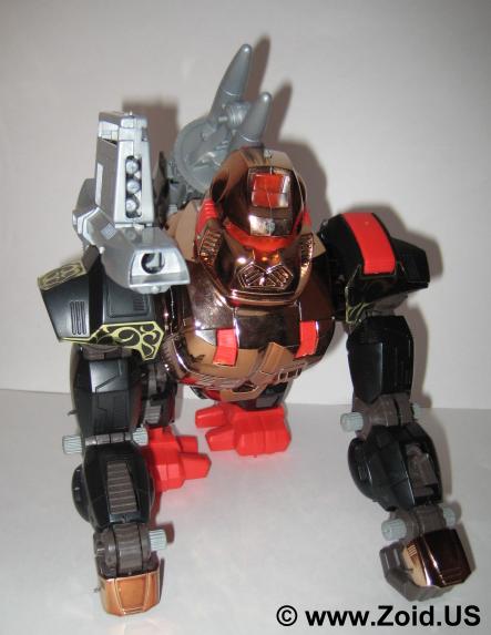 Iron Kong made it's first model appearance as "Gore the Lord Protector" (Lord Gore: The Protector) in the OER line, and was followed by the Robostrux version known as "Badox". Next came the chromed Zoids 2 version that went simply by the name of "Iron Kong". The chrome on the Zoids 2 Iron Kong can vary greatly. Some report gold bodies while others have a distinct copper tone. The Zoids 2 version is harder to come by and can fetch from $40.00 up to $100.00 for a complete version. The Techno Zoid Iron Kong was released in yellow and gray, and did not have any "back story". Armed with a set of six neon orange colored missiles, this whacky colored monkey is also harder to come by and can be put into a collection for around the same price as the Zoids 2 version ($40.00-$100.00).