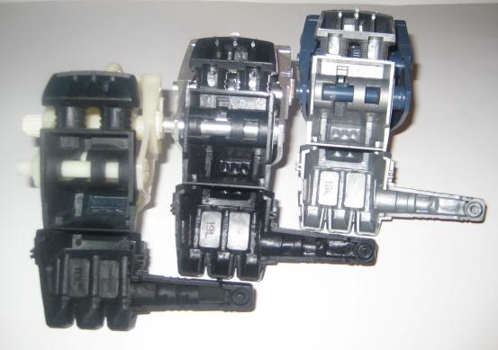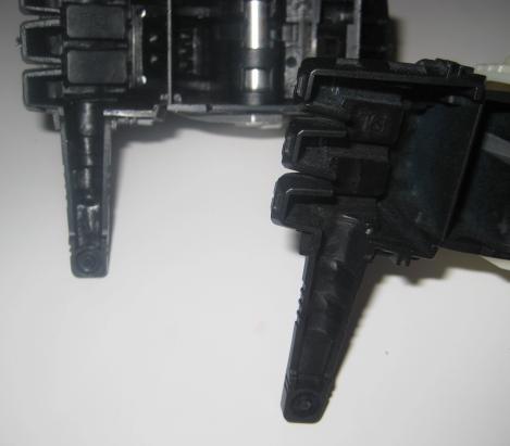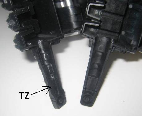 I removed the pieces from the box, and first observation led to examination of the foot assemblies. There is a slight difference in the molding of the inner foot, and the TZ version is lacking the molded support on the outer side, see below.